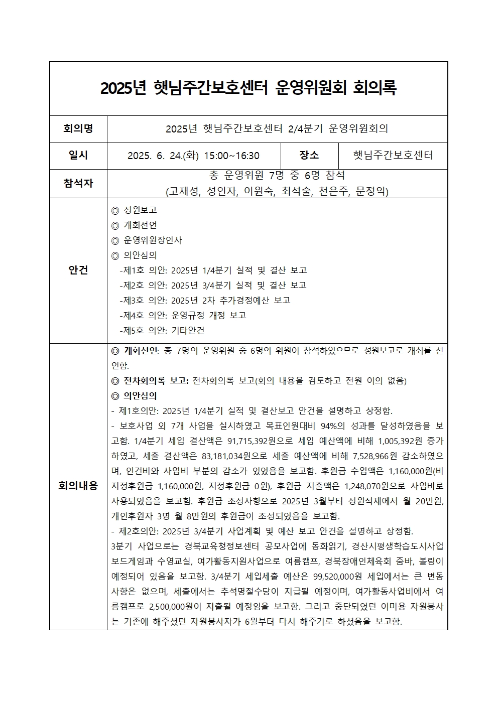 2025년 햇님주간보호센터 2/4분기 정기 운영위원회 회의록 공고