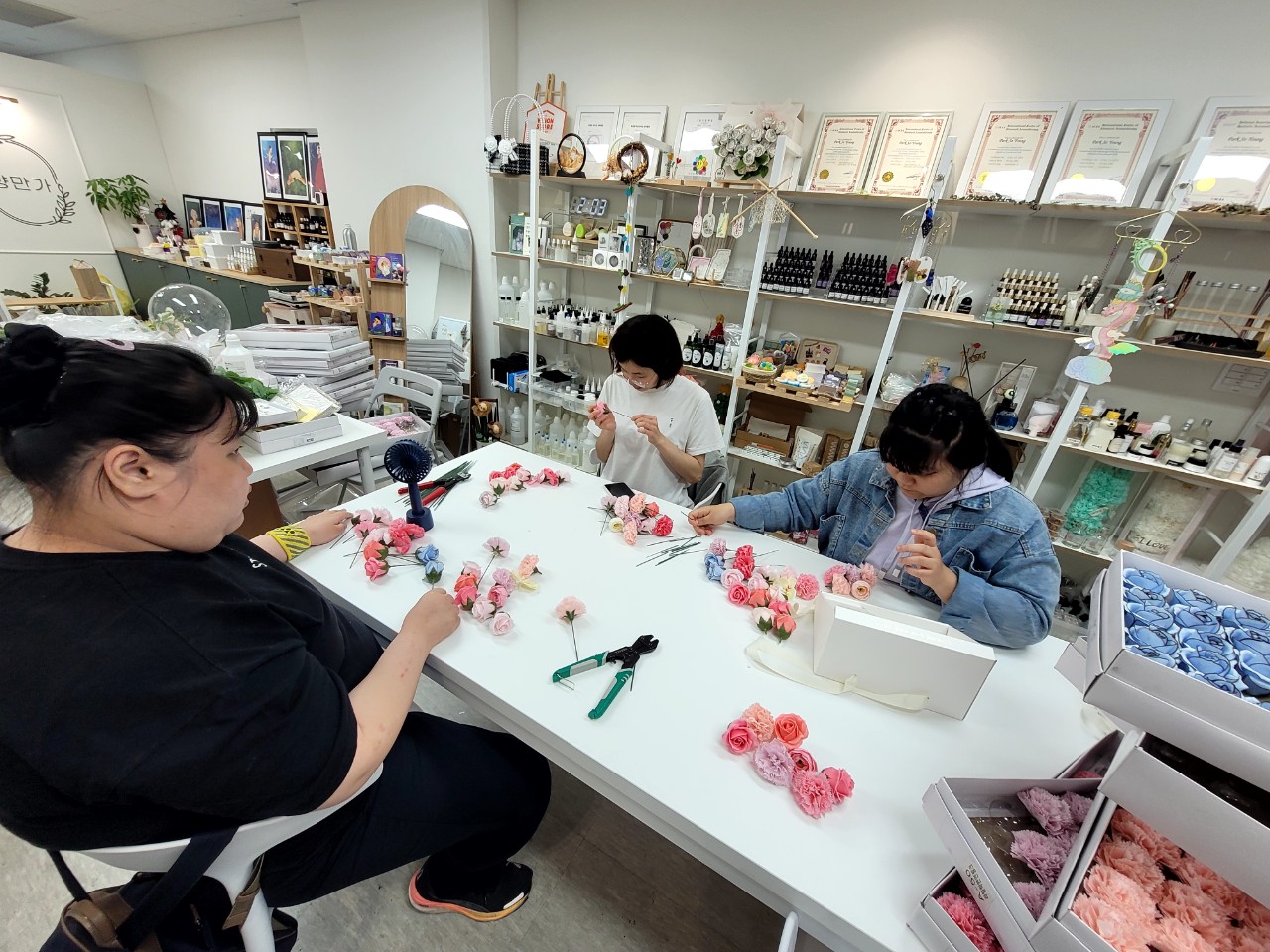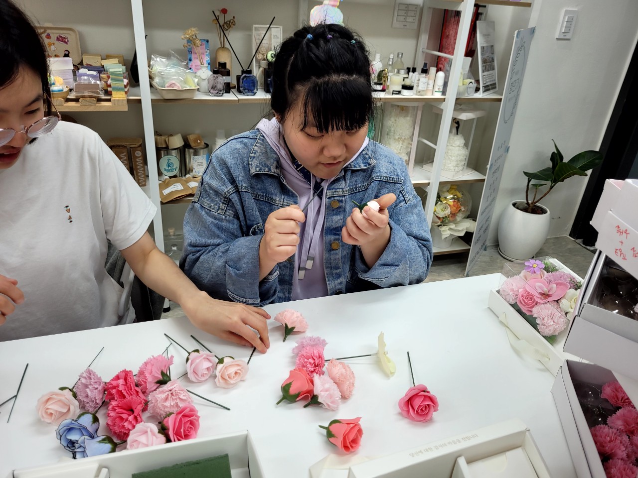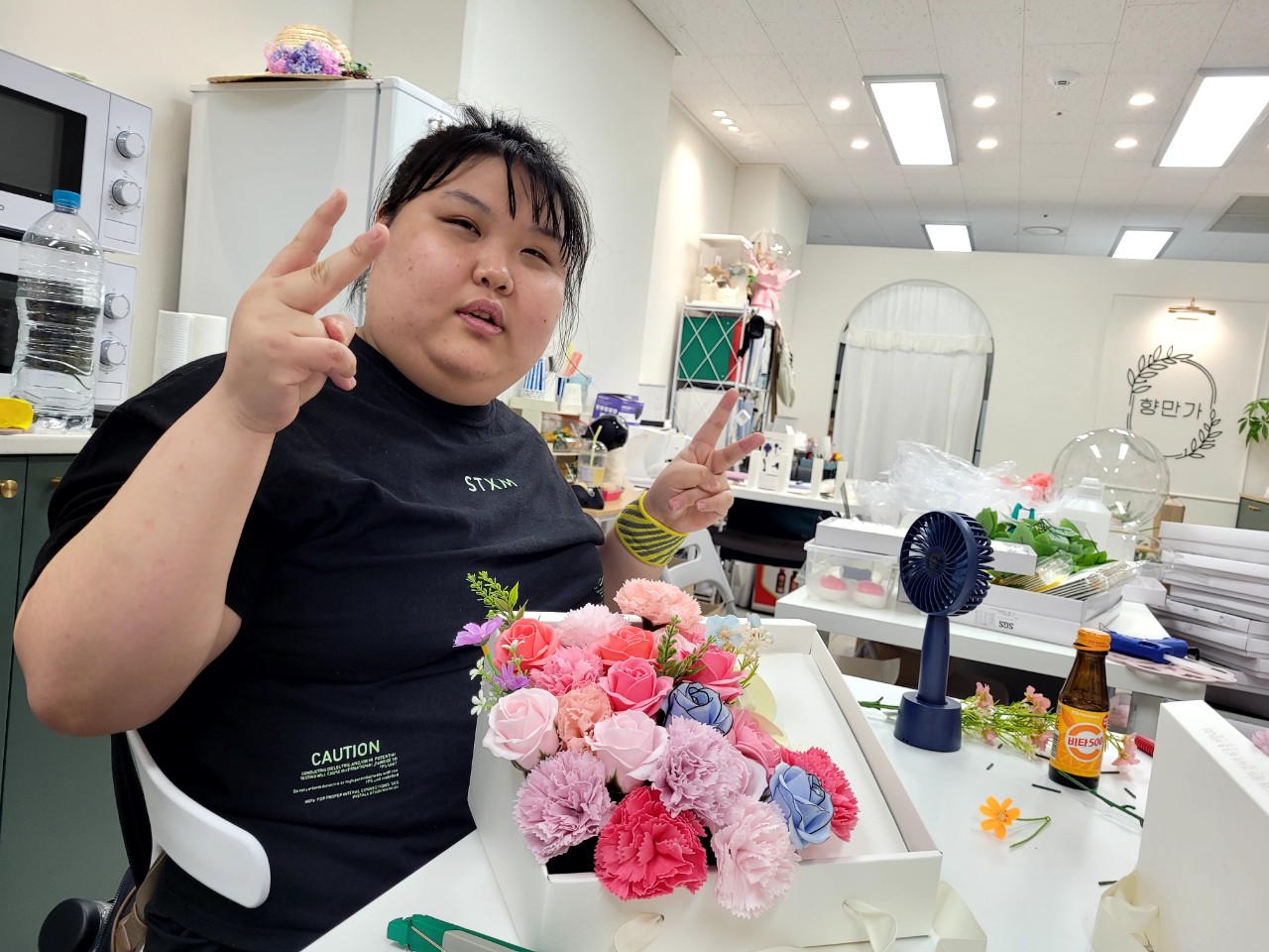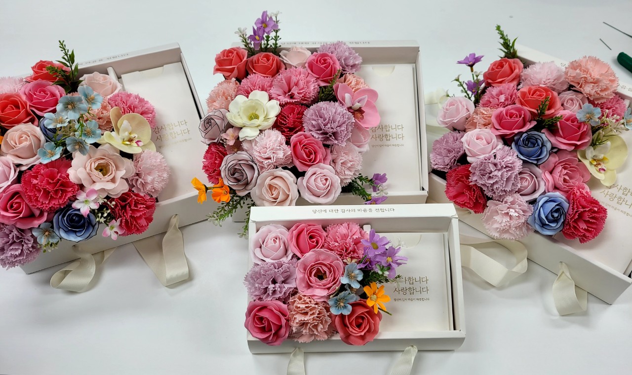 비누꽃에 조화를 더하니 어찌나 풍성한지 너무 예쁜 상자가 되었네요.