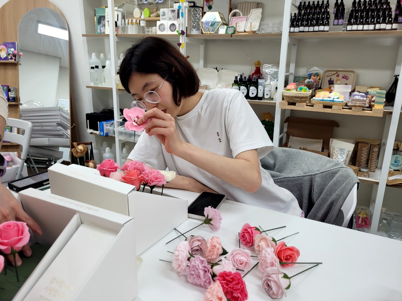 많은 비누꽃들 중 원하는 꽃을 고릅니다. 꽃대를 꽂아주고 꽃을 풍성하게 꽂아 상자를 완성합니다.